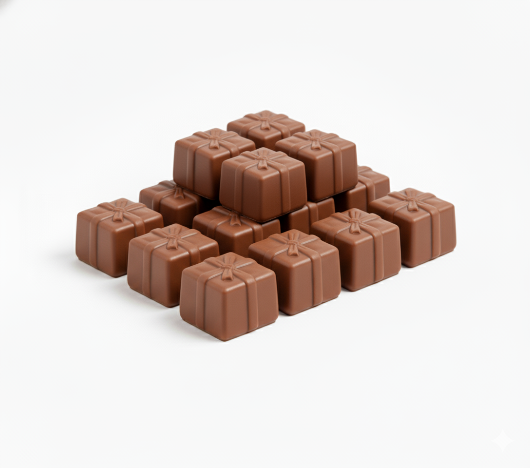 Bombones tradicionales de cacao y banana en una presentación grande para consumo frecuente o compartido.